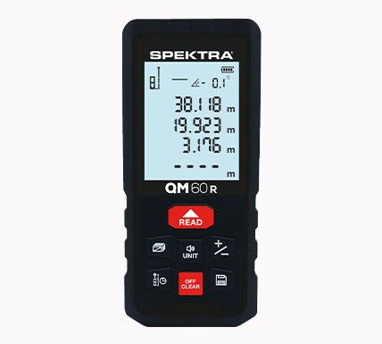 Distanziometro laser raggio rosso QM 60R, custodia in cordura, batterie ricaricabili, cinghia di sicurezza, connettore USB, manuale operativo.
